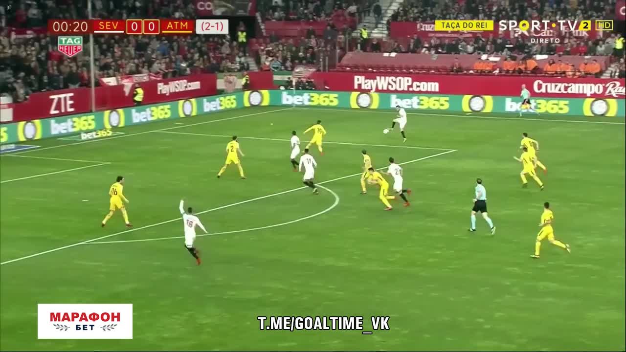 ورد النجم الفرنسي أنطوان غريزمان مهاجم أتلتيكو مدريد بهدف التعادل، في الدقيقة 13، سجله بتسديدة خرافية من خارج منطقة الجزاء من فوق سيرجيو ريكو حارس مرمى إشبيلية.