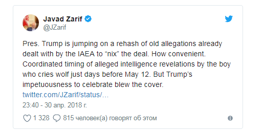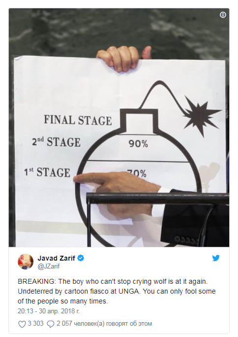 وكتب ظريف على حسابه على "تويتر": "هذا الصبي لا يستطيع أن يكف عن الكذب على غرار الراعي الكذاب، ويحاول من جديد أن يكرر عادته السابقة، فهو لم يتعظ من فضيحة الرسم الذي عرضه أمام الجمعية العامة للأمم المتحدة، وبإمكانه فقط خداع بعض الناس أكثر من مرة".
