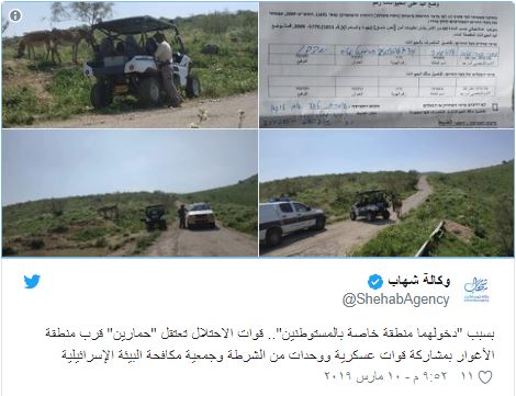 وأشار المسؤول الفلسطيني إلى أن الطرف الإسرائيلي يتهم الحمارين بأنهما دخلا الى منطقة خاصة بالمستوطنين.