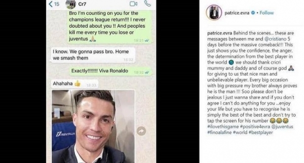 وظهر في محادثة اللاعبين، رسالة من إيفرا لرونالدو كتب فيها: "أخي أنا أعول عليك للعودة بدوري الأبطال. لم أشكك فيك أبدا. الناس يهاجمونني كل مرة تخسر فيها أنت أو يخسر فيها يوفنتوس".