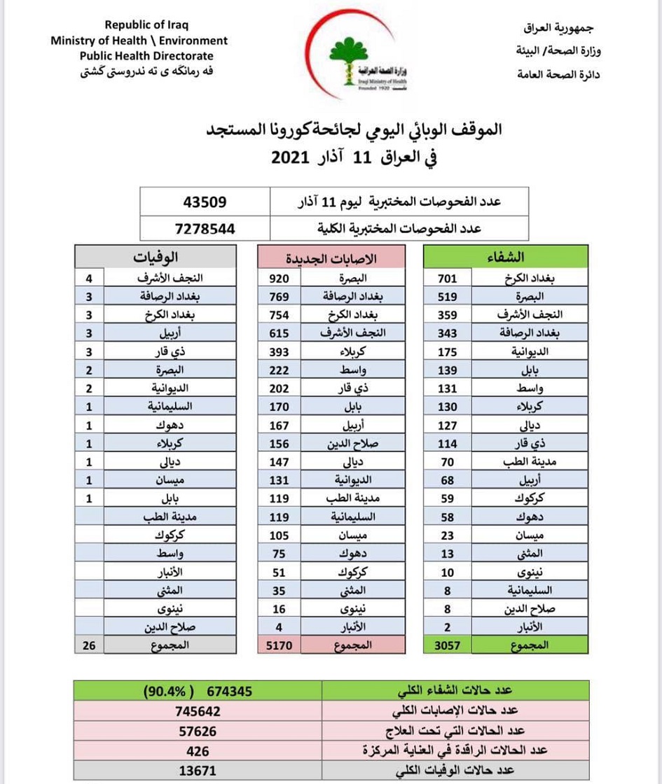 أما عدد الوفيات فكانت 26 حالة وعدد حالات الشفاء 3057 حالة. يذكر ان العراق سجل أعلى إصابة بالوباء في الخامس من شهر آذار الجاري حيث بلغت 5127 حالة. وكانت وزارة الصحة والبيئة، حذرت أمس الأربعاء، من خطورة الموقف الوبائي الحالي والذي من الممكن أن يؤدي إلى حالة تفشي وبائي أكبر وأخطر يهدد المنظومة الصحية الوطنية".