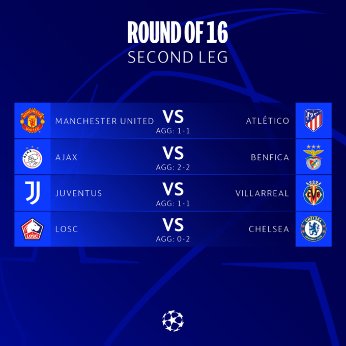 وتجمع المواجهة الأولى بين مانشستر يونايتد وضيفه أتلتيكو مدريد، والثانية بين بنفيكا ومضيفه أياكس أمستردام.