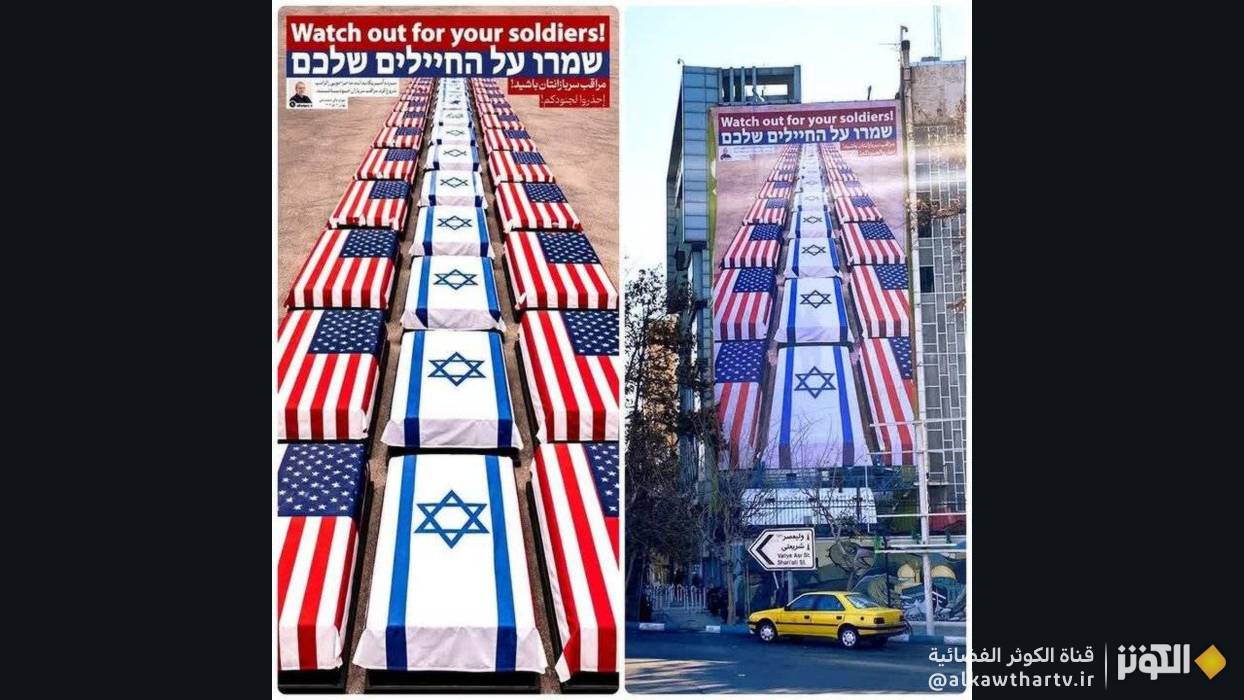 تصميمٌ مثيرٌ للاهتمام باللغتين العبرية والإنجليزية للجدارية في ساحة فلسطين بطهران، وذلك عقب التغريدة الأخيرة التي نشرها علي لاريجاني، أمين المجلس الأعلى للأمن القومي: انتبهوا لجنودكم!