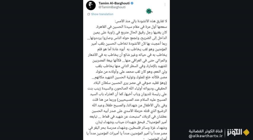 تميم البرغوثي، الأديب والسياسي الفلسطيني البارز (أنشودة "مدد يا أمير المؤمنين" في رثاء الإمام الحسين عليه السلام)؛