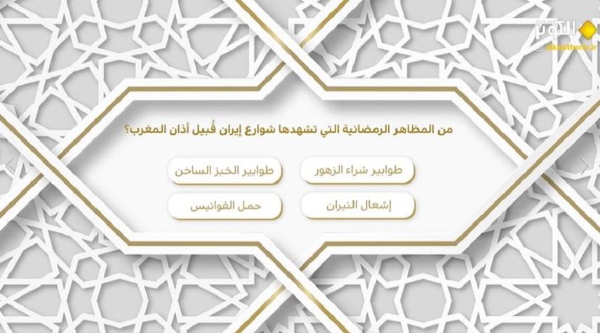 ثمة سؤال مطروح ضمن الفقرة الرمضانية المميزة "أمتنا" من اعداد قناة الكوثر الفضائية وهو "من المظاهر الرمضانية التي تشهدها شوارع ايران قبيل أذان المغرب؟