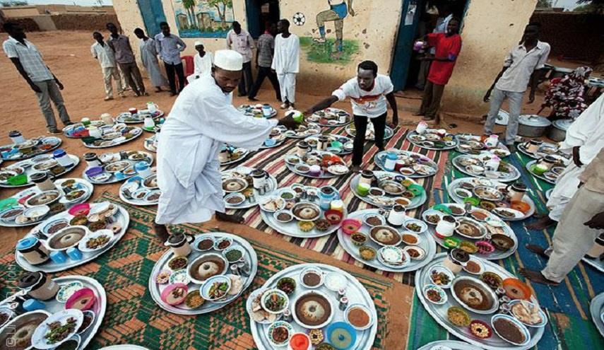 يتميز أهل السودان بالكرم والسخاء ففي شهر رمضان يحرص السودانيين علی إقامة الإفطار الجماعي في الشارع العام و أمام المنازل لكل عابر سبيل حتی یفوزوا بثواب إفطار الصائم، وأيضاً يتبادلون الطعام مع الجيران، و شخصية "المسحراتي" الموجودة عند كل الدول الإسلامية، و هم يفطرون بعد صلاة المغرب على أكل خفيف وبعد صلاة التراويح يتم تناول وجبة العشاء التي تتكون من اللحوم والخضار ثم وجبة السحور على الزبادي واللبن، و المشروب التقليدي الذي يفضله السودانيون أثناء شهر رمضان يسمونه «الحلو مر» و هو في أساسه خليط من الذرة المخمرة والبهارات وبعض الأعشاب، ويحتاج إعداده عدة أيام إضافة إلى مشروبات الكركديه والابري الأبيض والتبلدي والعرديب والقضيم، كما ظلت الأكلة الشعبية "العصيدة بالتقلية".