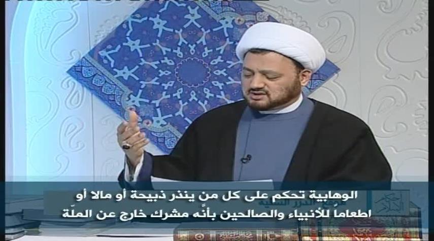 فقه الإسلام- الكوثر: أكد الشيخ أسد محمد قصير أن الوهابية تحكم على كل من ينذر ذبيحة أو مالا أو اطعاما للأنبياء والصالحين بأنه مشرك خارج عن الملة...