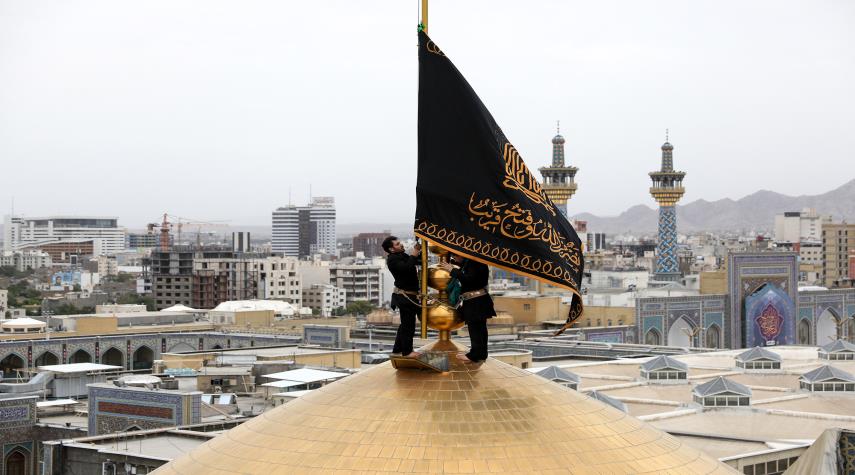 ايذانا لشهر الاحزان... تبديل راية قبة الامام الرضا عليه السلام+ فيديو