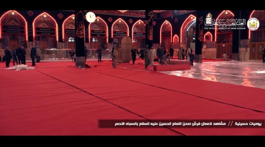 بالفيديو... اكساء صحن الامام الحسين (ع) بالسجاد الاحمر