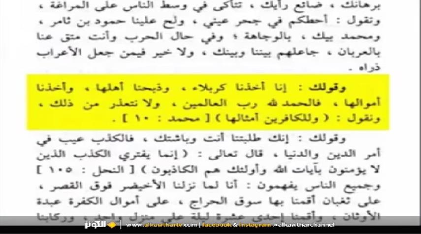 خاص الكوثر - الوجه الاخر: كشف سماحة الشيخ صادق اخوان في برنامج الوجه الآخر فضيحة من العيار الثقيل، قول سعود بن عبد العزيز بن محمد بن سعود في "كتاب الجهاد" الصفحة 284 ، حيث قال بن سعود "إنّا أخذنا كربلاء وذبحنا أهلها ...فالحمد لله ولا نعتذر من ذلك" !!!.