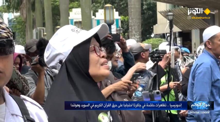 تظاهر آلاف الأشخاص في إندونيسيا، أمام السفارة السويدية في جاكرتا للتعبير عن غضبهم إزاء احتجاجات يمينية أُتلفت خلالها حرقاً وتمزيقاً نسختان من القرآن الكريم في السويد وهولندا.