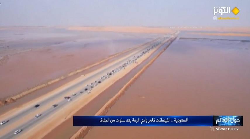 اظهرت مقاطع مصوّرة التقطتها طائرة مسيرة الفيضانات في وادي الرمّة الذي يعدّ أكبر وأطول الأودية النهرية في المملكة السعودية.