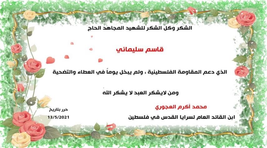 فلسطين - الكوثر: وجّه نجل القائد العام لسرايا القدس ومدير قناة فلسطين اليوم في طهران "محمد أكرم العجوري" باقات الشكر للشهيد المجاهد الحاج قاسم سليماني، تعبيراً منه عن مكانة الشهيد في قلوب المجاهدين ودوره في دعم المقاومة الفلسطينية.
