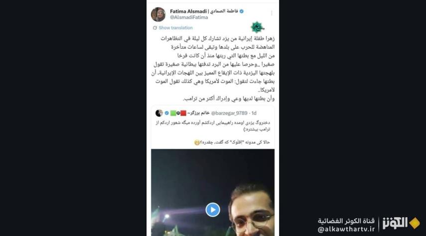 ذكرت فاطمة الصمدي، الخبيرة في الشأن الإيراني لدى مركز الدراسات التابع لقناة الجزيرة، أن طفلة تُدعى زهرا من مدينة يزد تشارك يومياً في الاحتجاجات المناهضة للحرب ضد بلدها، حيث تبقى حتى ساعات متأخرة من الليل برفقة بطتها التي قامت بتربيتها منذ كانت فرخاً صغيراً.