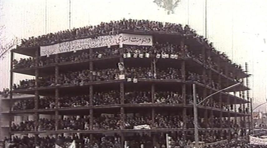 مشهد من حشود غفيرة اعتلت أحد الأبنية قيد الإنشاء في انتظار الإمام الخميني (قدس)، حاملين صور الإمام وهم يهتفون باسمه.