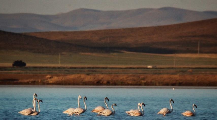 ايران - الكوثر: عادت طيور النحام الوردي أو الفلامينغو، واللقلق والكرسوع الى حوض "آق قلا" في محافظة كلستان (شمال ايران)، بعد امتلاء الاحواض بالماء بسبب الأمطار التي هطلت مؤخرا في البلاد.