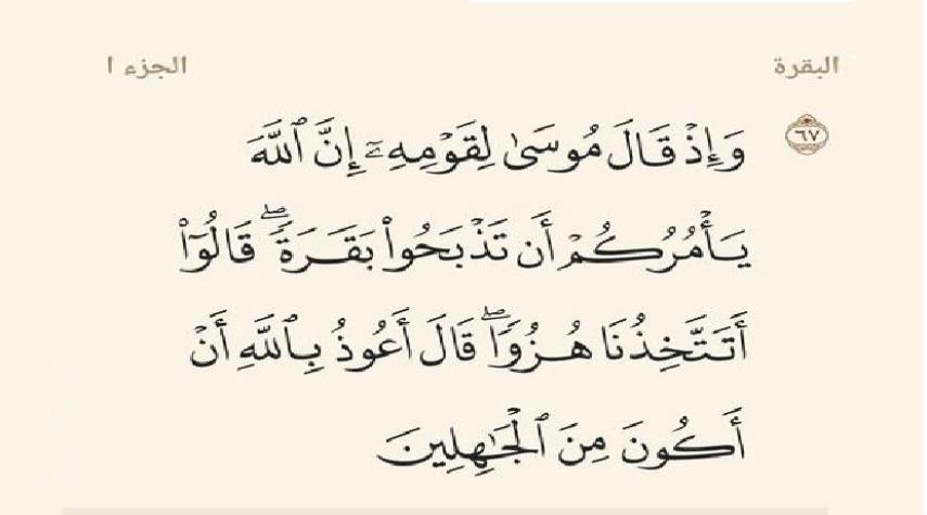 {وَإِذْ قَالَ مُوسَى لِقَوْمِهِ إِنَّ اللَّهَ يَأْمُرُكُمْ أَنْ تَذْبَحُوا بَقَرَةً قَالُوا أَتَتَّخِذُنَا هُزُوًا قَالَ أَعُوذُ بِاللَّهِ أَنْ أَكُونَ مِنَ الْجَاهِلِينَ}.. سورة البقرة : آية 67