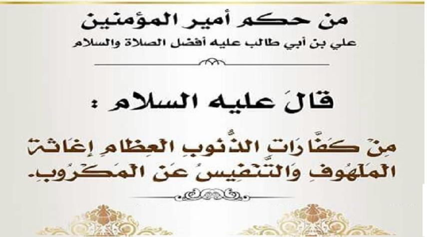 نهج البلاغة-الكوثر: روي عن أمير المؤمنين علي عليه السلام من حٍكَمِهِ في نهج البلاغة: (مِنْ كَفَّارَاتِ الذُّنُوبِ الْعِظَامِ إِغَاثَةُ الْمَلْهُوفِ، وَالتَّنْفِيسُ عَنِ الْمكْرُوبِ).