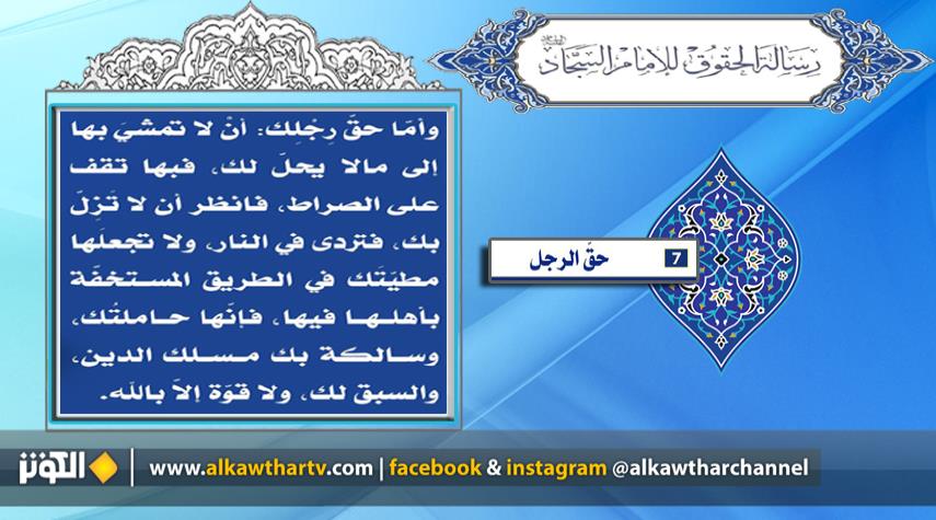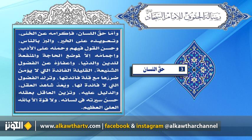 خاص الكوثر _اسلاميات: رسالة الحقوق وهي عبارة عن مجموعة بنود كتبها الإمام علي بن الحسين حفيد علي بن أبي طالب وفاطمة بنت رسول الله في الإسلام إثر مقتل والده الحسين بن علي في واقعة الطف بكربلاء .