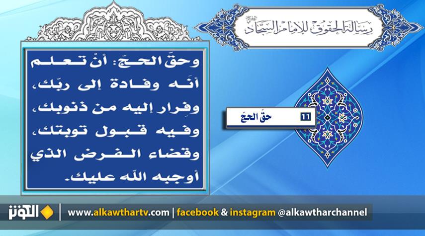 خاص الكوثر _اسلاميات: اليكم شرح عن البند الـ 11 من رسالة الحقوق للإمام السجاد تحت عنوان "حق الحج" لبيان جميع الحقوق على الإنسان تجاه ربه ونفسه ومحيطه.