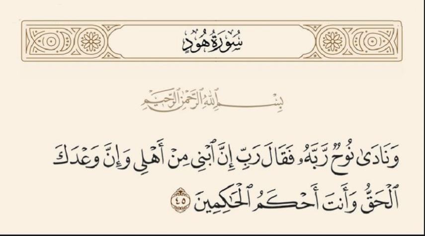 القرآن الكريم-الكوثر: قال الله العظيم في محكم كتابه الكريم: (وَ نادی نُوحٌ رَبَّهُ فَقالَ رَبِّ إِنَّ ابْنِي مِنْ أَهْلِي وَ إِنَّ وَعْدَكَ الْحَقُّ وَ أَنْتَ أَحْكَمُ الْحاكِمِينَ) (آية 45 من سورة هود المبارك) .