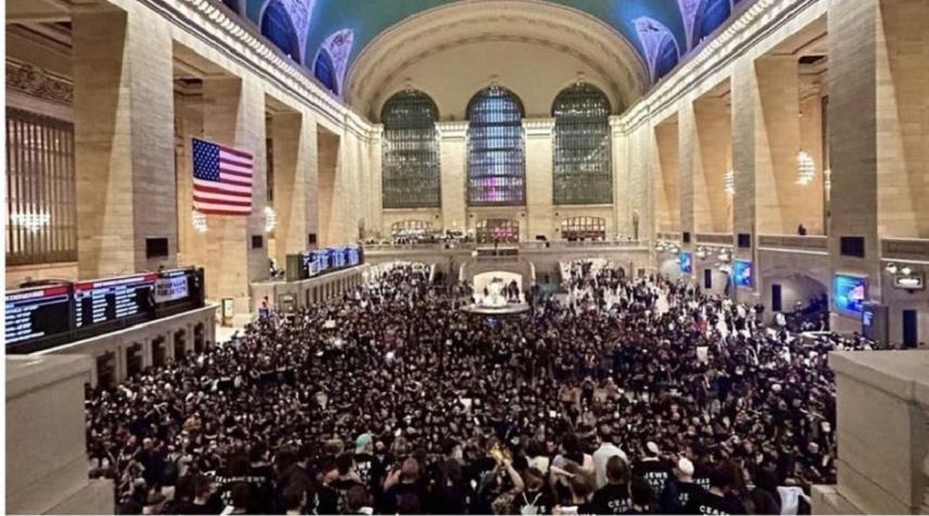احتشد المئات من اليهود المناصرين للسلام في محطة قطارات "غراند سنترال" الشهيرة، وسط مدينة نيويورك الأمريكية؛ بهدف المطالبة بوقف العمليات العسكرية الإسرائيلية ضد قطاع غزة، وإعلان وقف إطلاق نار عاجل.