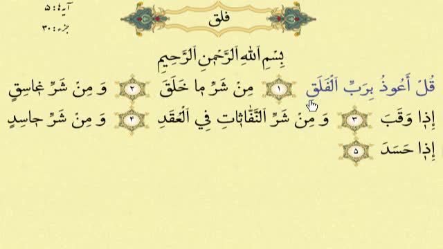 سورة الفلق مع النص القرآني بصوت شهريار برهيزكار مترجمة باللغة الفارسية