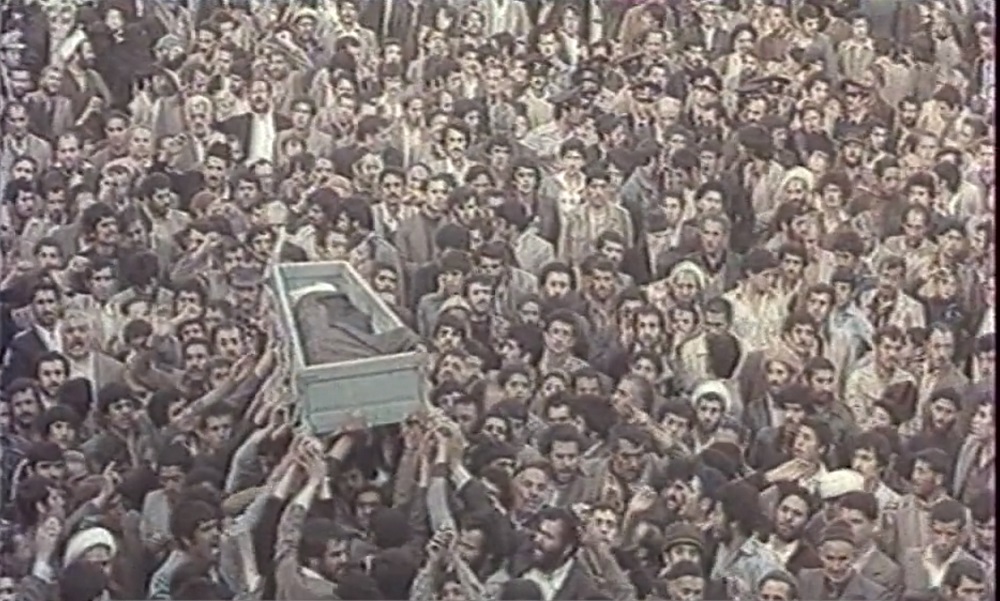 تشييع حاشد لأحد شهداء الثورة الإسلامية في إيران يتقدمه مجاهدون يحملون البندقيات وفي أفواهها الورود، ويطوفون بجثمان الشهيد في حرم السيدة المعصومة عليها السلام في مدينة قم المقدسة.