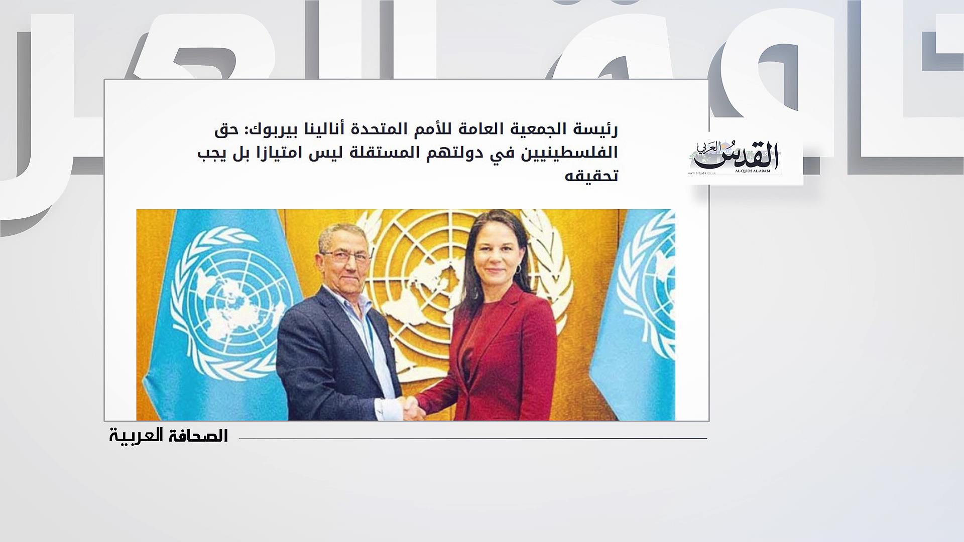 • الصحافة العربية.. رئيسة الجمعية العامة للأمم المتحدة أنالينا بيربوك: حق الفلسطينيين في دولتهم المستقلة ليس امتيازا بل يجب تحقيقه | 2025-12-15