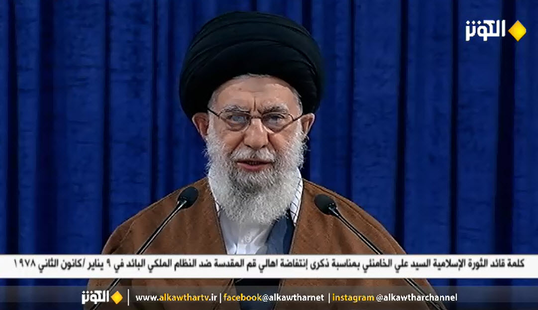 كلمة سماحة القائد الثورة الاسلامية الامام علي الخامنئي امس الاحد عبر الاتصال المرئي مع حشد من المواطنين من مدينة قم المقدسة ،تم نقلها تلفزيونيا على الهواء في ذكرى انتفاضة اهالي المدينة يوم 9 كانون الثاني /يناير عام 1978 ابان حكم نظام الشاه.