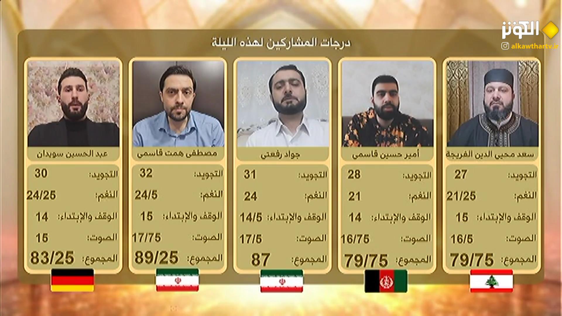 وحصل المتسابق المشارك من إيران " مصطفى همت قاسمي " على 89.25 درجة.