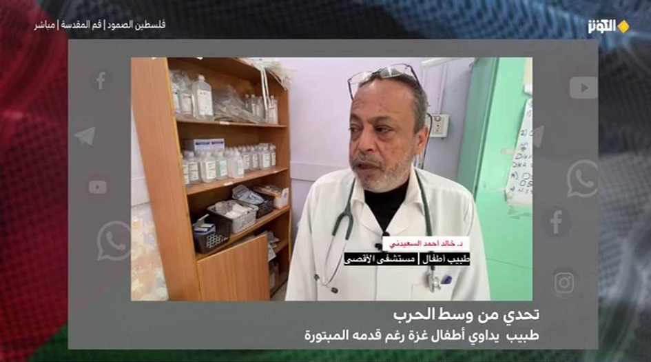 الطبيب خالد أحمد السعيدني الذي يعشق مهنته كثيراً ورغملاأن قدمه قد بترت بسبب اصابته في الحرب في غزة ورغم أنه يعاني من مرض السكر أيضاً إلا أنه أبى إلا وأن يعود إلى عمله في علاج ومداوة الأطفال المرضى والجرحى في قطاع غزة .