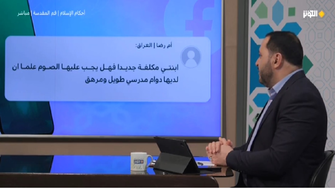 أجاب الشيخ أسد محمد قصير على سؤال مشاهدة قناة الكوثر أم رضا من العراق الذي يقول: ابنتي مكلفة جديداً فهل يجب عليها الصوم في شهر رمضان علماً أنه لديها دوام مدرسي طويل ومرهق؟ يكون بلوغ البنت بإكمال تسع سنوات قمرية "8 سنين و9 أشهر ميلادي (شمسي)".