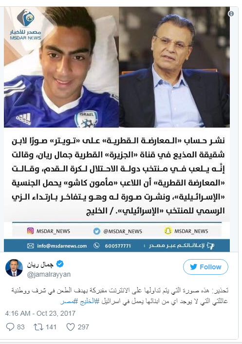 وقال ريان في تدوينات له عبر حسابه على تويتر معلقا على صورة نشرها الذباب الإلكتروني تقول أن نجل شقيقه يلعب في نادي إسرائيلي، تحذير: هذه صورة التي يتم تداولها على الانترنت مفبركة بهدف الطعن في شرف ووطنية عائلتي التي لا يوجد اي من ابنائها يعمل في اسرائيل.