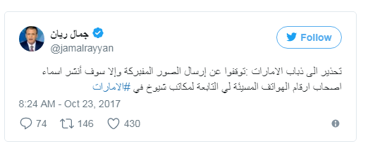 وأضاف في تغريدة اخرى: تحذير الى ذباب الامارات :توقفوا عن إرسال الصور المفبركة وإلا سوف أنشر اسماء اصحاب ارقام الهواتف المسيئة لي التابعة لمكاتب شيوخ في الامارات.