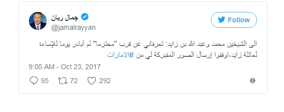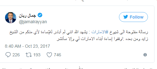 ووجه ريان تحذيرا مباشرا لحكام لامارات قائلا: رسالة مفتوحة الى شيوخ الامارات : يشهد الله انني لم أبادر للإساءة لأي منكم من الشيخ زايد ومن بعده ،اوقفوا إساءة أبناء الامارات لي وإلا سأنشر