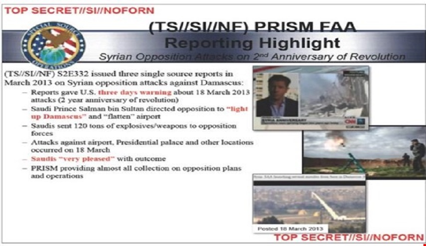 وتابع موقع الصحيفة، أما وراء الهجمات، فقد ظهر نفوذ القوة الأجنبية، فوفق الوثيقة "السرية جداً"والتي تسلّمها موقع الصحيفة من الضابط السابق في الاستخبارات الأميركية إدوارد سنودن، حيث صدر القرار بشنّ هذه الهجمات الصاروخية مباشرة من أحد أعضاء الأسرة السعودية الحاكمة، وهو الأمير سلمان بن سلطان. وأوضح معدّ التقرير أن الهدف من وراء القيام بهذه الهجمات في ذلك الوقت بالذات كان من أجل "تسجيل الاحتفال بالذكرى الثانية لاندلاع الثورة السورية".
