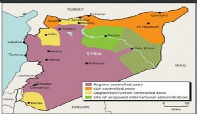 المشروع الامريكي يريد أن يكون البترول بيد قوات التحالف الامريكي و أن يشكل هذا التحالف منطقة عازل لفيدرالية كردية على أن تكون في مناطق غير متصلة يفصل بينها الجيش التركي شمال حلب و في إدلب و بالتالي دخول التركي لإدلب لم يأت وفقاً لقرارات أستانا بل وفقاً للقرارات الامريكية, حيث أن ما طرحته المراكز البحثية الامريكية هو وضع كل من ادلب و شمال حلب و درعا تحت الرعاية التركية في ثلاث مناطق منفصلة و منطقتين كرديتين تحت رعاية البرزاني (قسد) و منطقة فصل للاحتلال الامريكي .