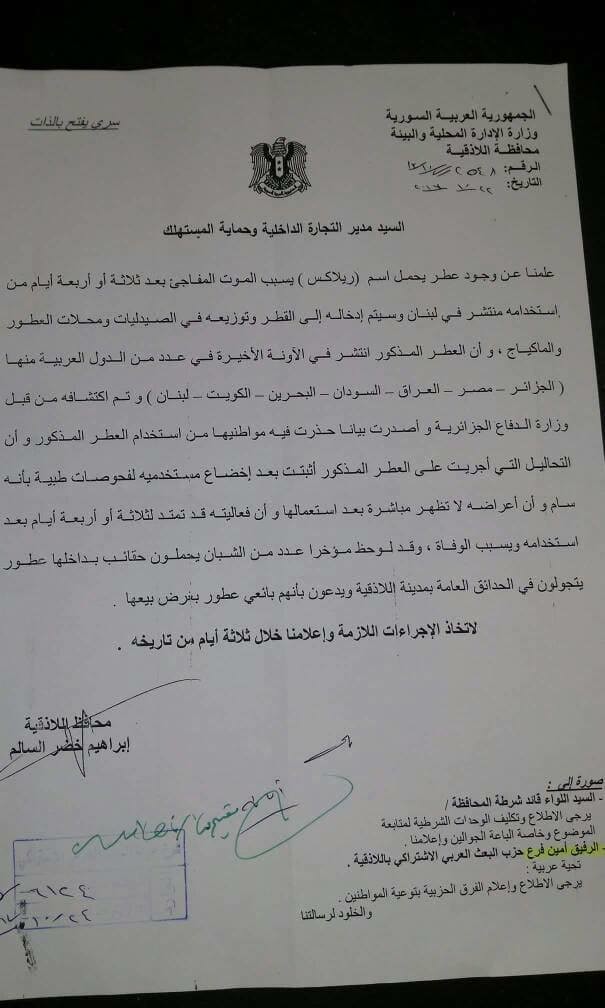 وذكرت وسائل إعلام سورية أن الوزارة تحركت وأصدرت التحذير بعد أن وجهت محافظة اللاذقية كتابا إليها سلّطت فيه الضوء على ملاحظة انتشار عدّة أشخاص في المدينة، يجولون في الحدائق ويحملون حقائب، ويزعمون أمام "زبائنهم" بأنهم باعة "عطور"، محذّرةً من أن يكونوا من الأشخاص الذين يسوّقون لهذا "العطر القاتل".