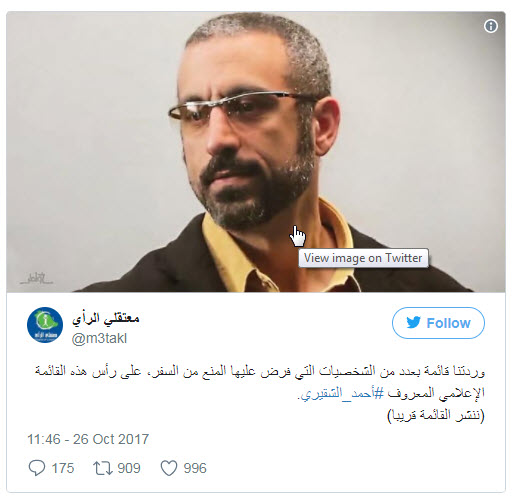 وقال حساب "معتقلي الرأي"، إن قائمة جديدة أعدتها الحكومة بأسماء الشخصيات الممنوعة من السفر، وجاء على رأسها أحمد الشقيري.