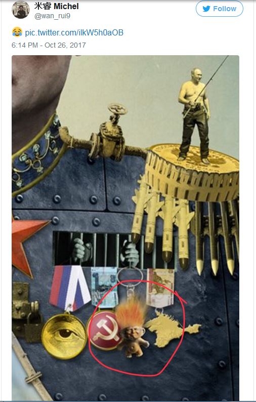 الملفت أن من بين النياشين والأوسمة المعلقة في الصورة، على بزة القيصر التي يرتديها بوتين، وساما على شكل علّاقة صغيرة تصور رأس الرئيس الأمريكي دونالد ترامب.