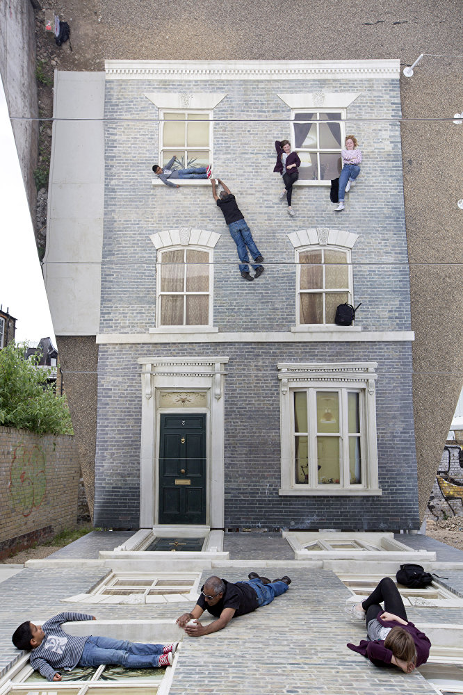 (المرآة هي الأداة العمل المفضلة لدى جميع السحرة. تقع واجهة المنزل على الأرض وعندما تضع مرآة أمامك، يبدو وكأنك تسقط من النافذة أو تتسلق على الجدار، لندن، بريطانيا).