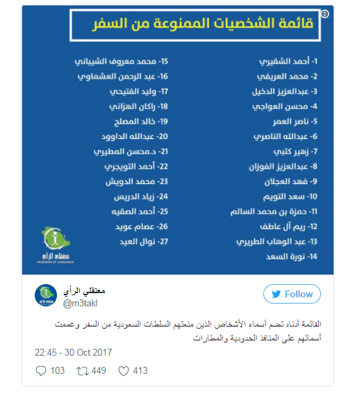 القائمة أدناه تضم أسماء الأشخاص الذين منعتهم السلطات السعودية من السفر وعممت أسماءهم على المنافذ الحدودية: