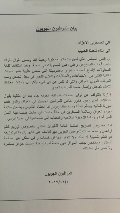 وطالب المراقبون في بيان لهم، نشر اليوم ( 1 تشرين الثاني 2017)، بـ "تنفيذ الوعود التي أطلقتها أكثر من جهة نيابية وحكومية، بكتب رسمية، وتحقيق جميع المطالب المشروعة من مخصصات فنية وقانون المراقب الجوي".