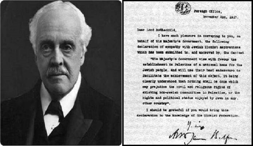 وقام بلفور في الثاني من تشرين الثاني 1917، بتوجيه رسالة مطبوعة الى الممثل الأعلى للطائفة اليهودية البريطانية اللورد والتر روتشيلد، صادقت عليها الحكومة البريطانية، وطلب منه فيها أن يبلغ مضمونها الى الاتحاد الصهيوني.