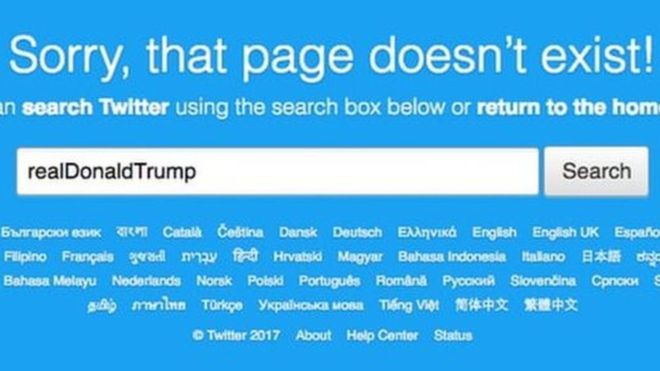 تفاجأ زوار صفحة الرئيس الأمريكي دونالد ترامب على موقع التواصل الاجتماعي "تويتر"، بجملة "عفوا الصفحة غير موجودة".