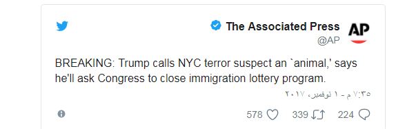 وفي مقابلة أخرى، قال ترامب إن البطاقات الخضراء تسمح بوصول "الحيوانات" إلى الولايات المتحدة، مثل منفذ العمل الإهابي في نيويورك.