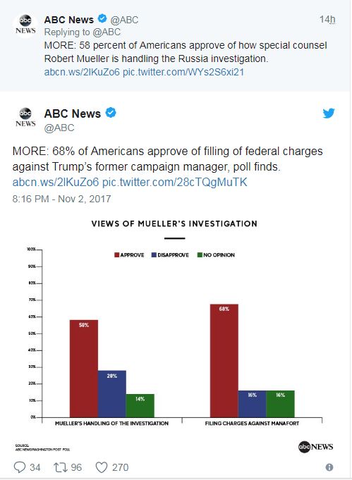 وبحسب التقرير، فإن نسبة 51% قالت عن تعاون ترامب مع موللر إنه لا يتعاون، ونسبة 37% قالت إنه يتعاون، فيما لم تبد نسبة 12% رأيها، مشيرا إلى أن نسبة 53% قالت إن التهم التي وجهت لكل من مانفورت، والشريك التجاري السابق له ريتشارد غيتس، والمستشار السابق لحملة ترامب جورج بابادولوس، هي تعبير عن جريمة أوسع.