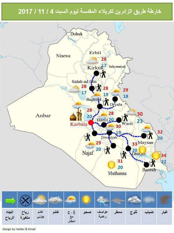العراق _ الكوثر: نشر موقع السومرية نيوز خريطة تظهر طريق سير زائري أربعينية الإمام الحسين "ع" ودرجات الحرارة المتوقعة في كل منطقة يمرون بها.