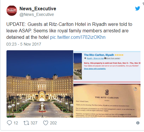 ونشر حساب "News Executive" تغريدة تقول: "النزلاء في فندق ريتز كارلتون طلب منهم المغادرة في أقرب فرصة. يبدو أن أعضاء العائلة المالكة الموقوفين احتجزوا في الفندق".
